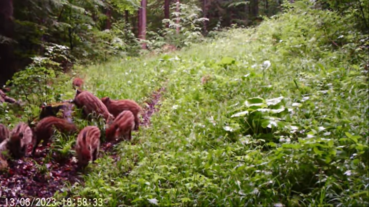 Imaginile cu o familie numeroasă de mistreți au fost surprinse în Parcul Național Cheile Bicazului – Hășmaș.