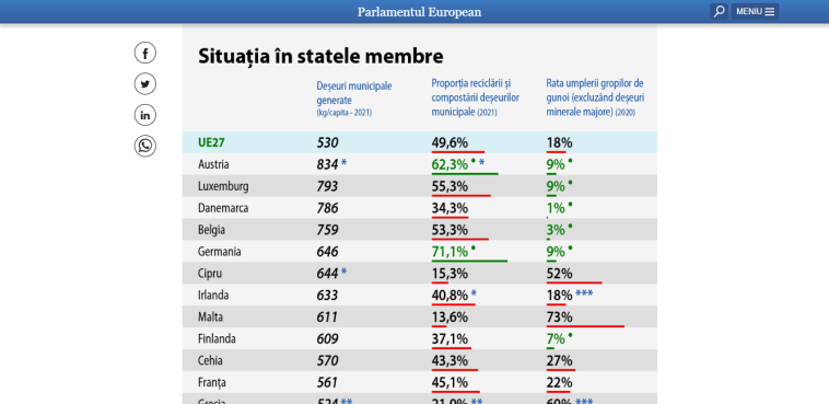 Datele arată diferențe mari între țările UE în privința cantității și modului de gestionare a deșeurilor, însă există o tendință spre mai multă reciclare și mai puțină folosire a gropilor de gunoi.