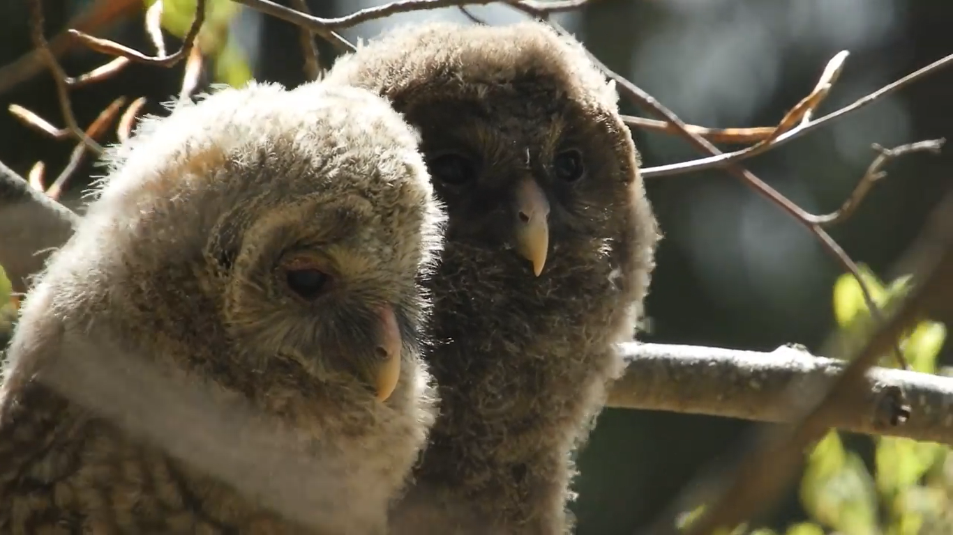 Doi pui de huhurez mare (Strix uralensis) au stat cuminți la o scurtă ședință video, știind că părinții nu sunt prea departe. Imaginile au fost surprinse în Parcul Natural Bucegi